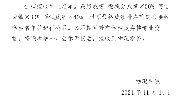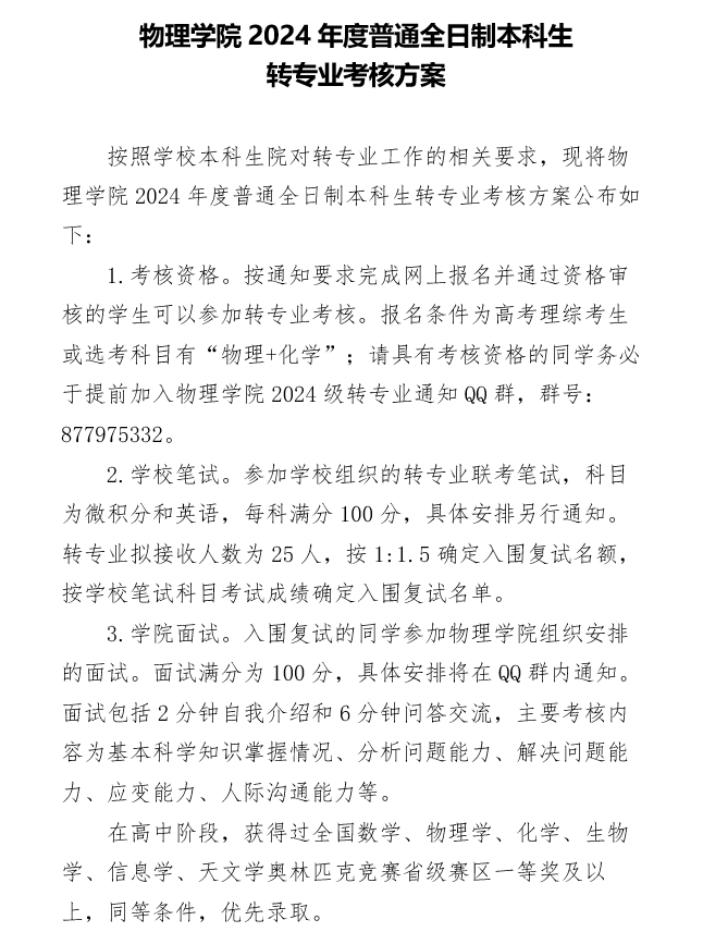 物理学院2024年度普通全日制本科生转专业考核方案