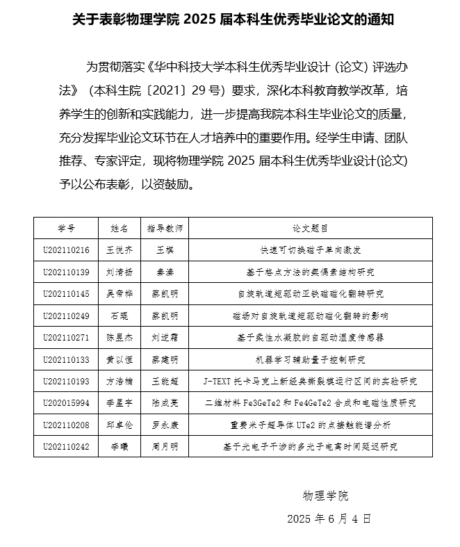 关于表彰物理学院2025届本科生优秀毕业论文的通知