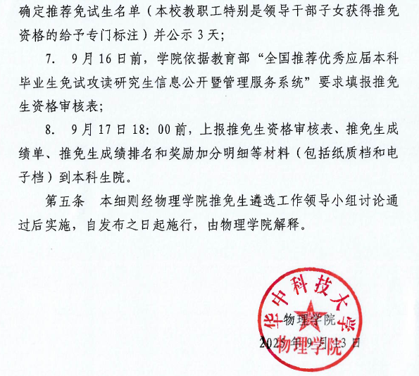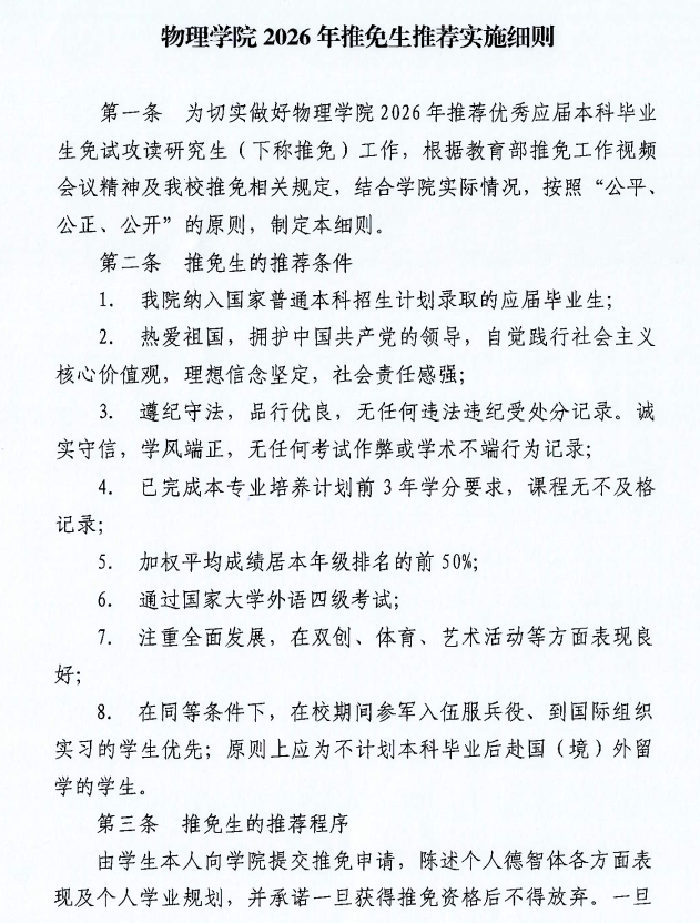 物理学院2026年推免生推荐实施细则