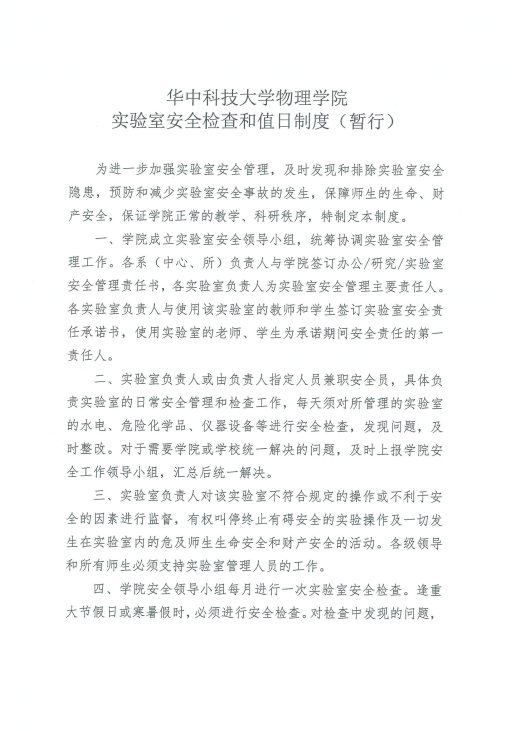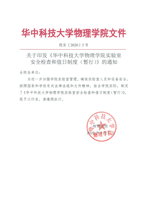 院安〔2020〕3号关于印发《华中科技大学物理学院实验室安全检查和值日制度(暂行)》的通知