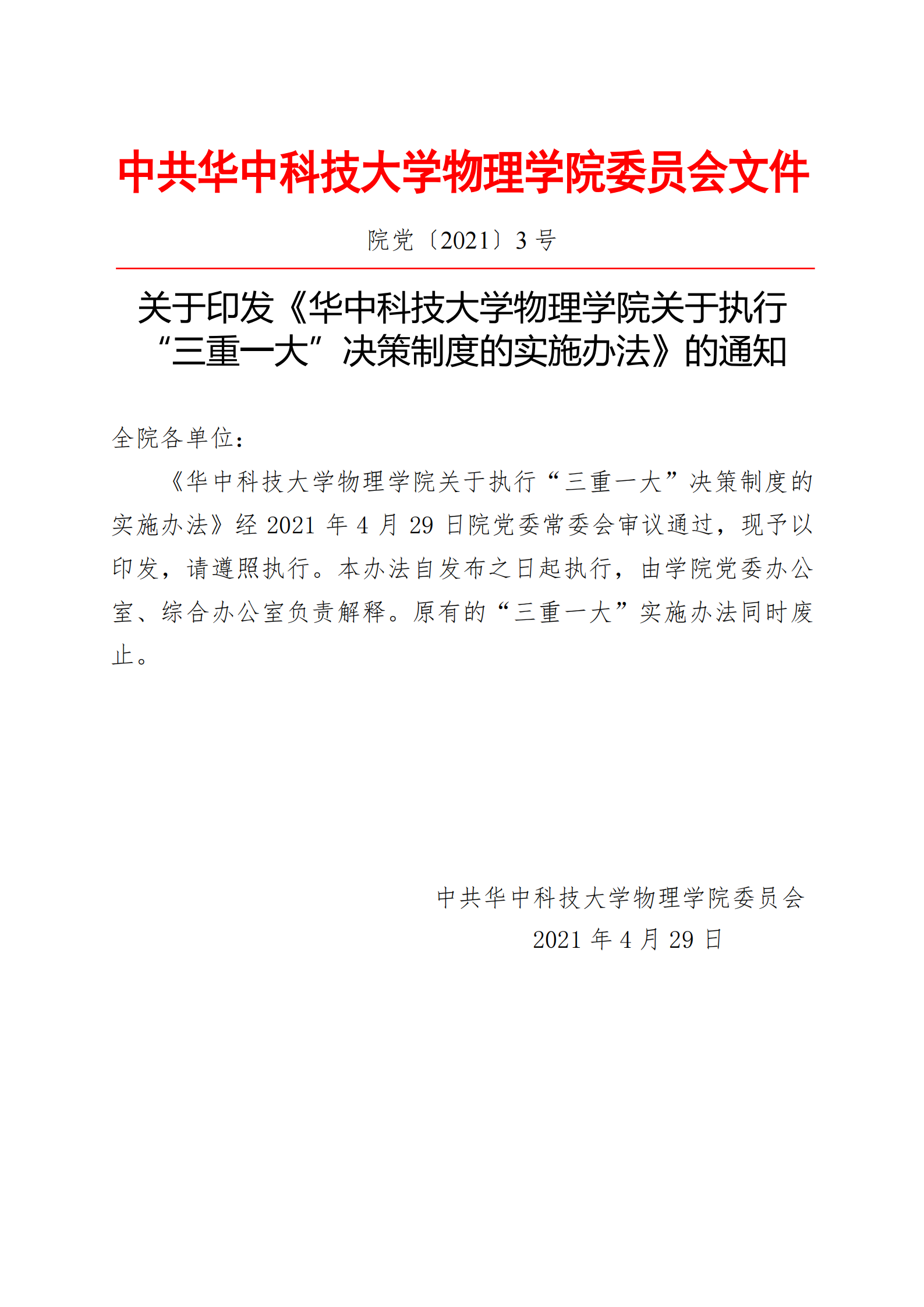 院党〔2021〕3号关于印发《华中科技大学物理学院关于执行“三重一大”决策制度的实施办法》的通知