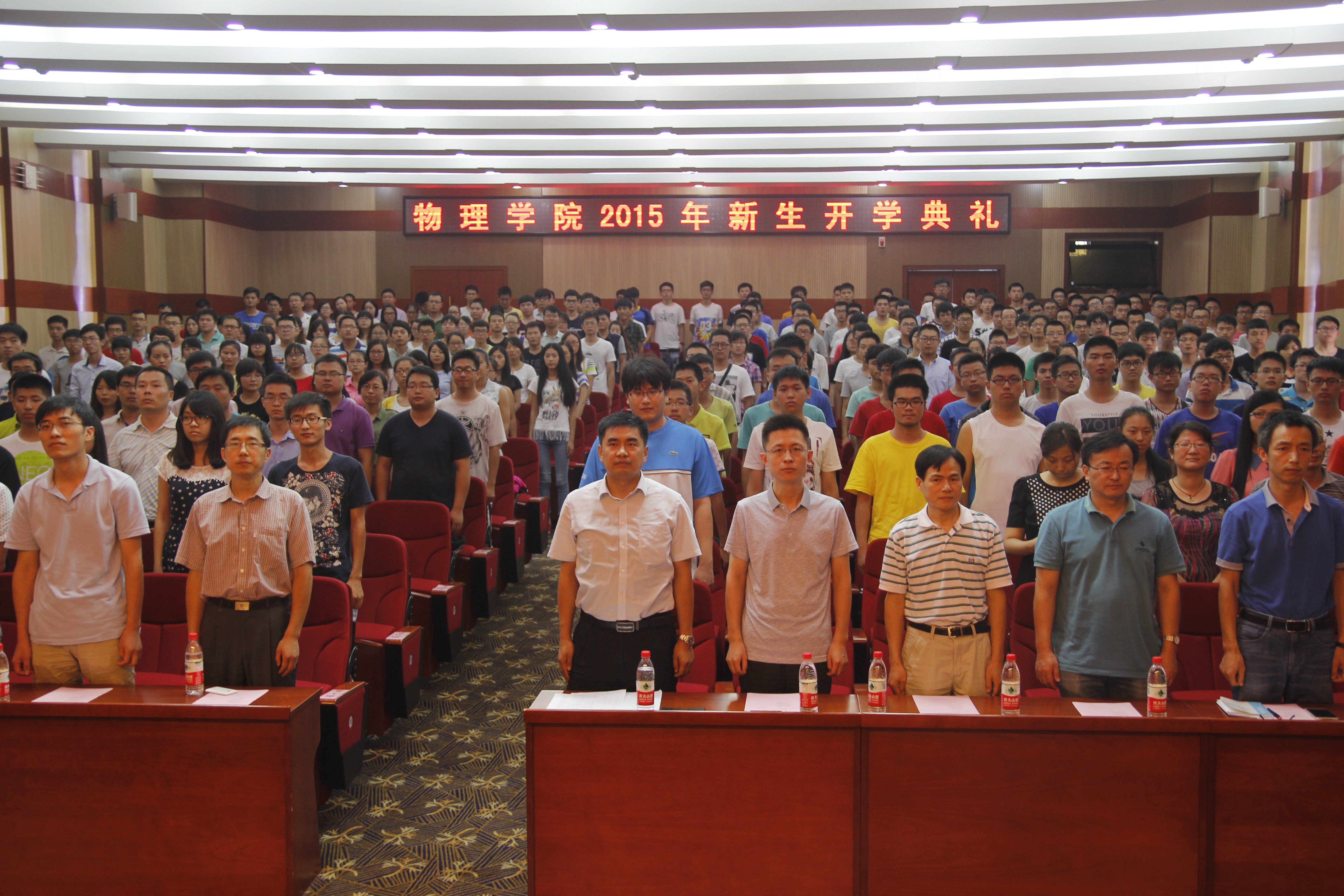 开学典礼在庄严肃穆的国歌声中拉开了序幕。物理学院副院长陈相松教授致辞。陈院长首先对2015级新同学表示热烈欢迎,他从中华民族传统文化顽强的生命力入手,讲述了我们民族百折不挠、奋勇拼搏的可贵精神。他希望大家为身在伟大的民族感到幸运;也为处在美好的城市、快速发展的学校、欣欣向荣的学院而感到幸运。同时,他希望大家能珍惜这份幸运,把握人生的黄金阶段,奋勇拼搏,努力提高自己的综合能力,不辜负自己的天赋,不辜负自己的青春。
