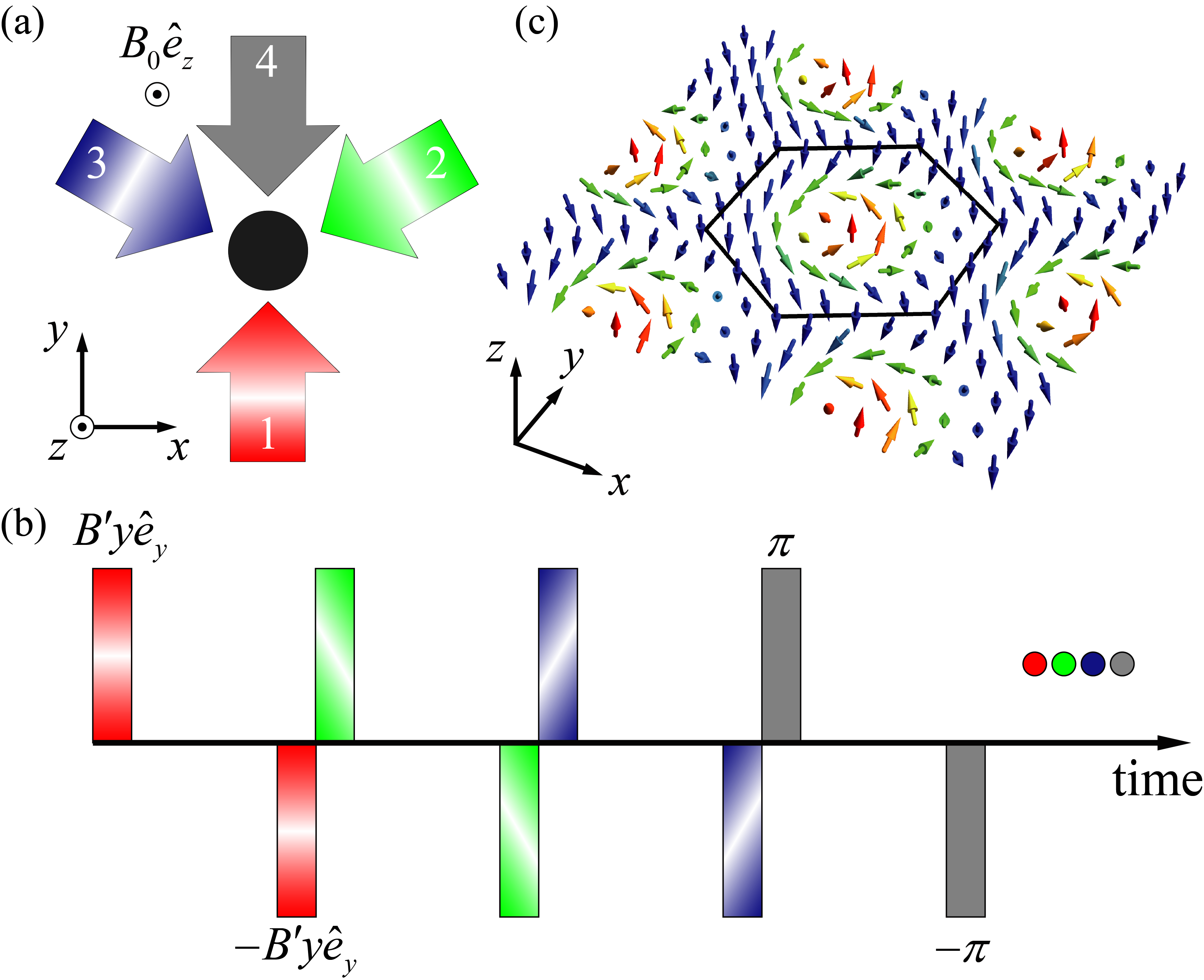图1. 用不同空间取向的磁场脉冲序列(a,b)来合成等效周期磁场(c).