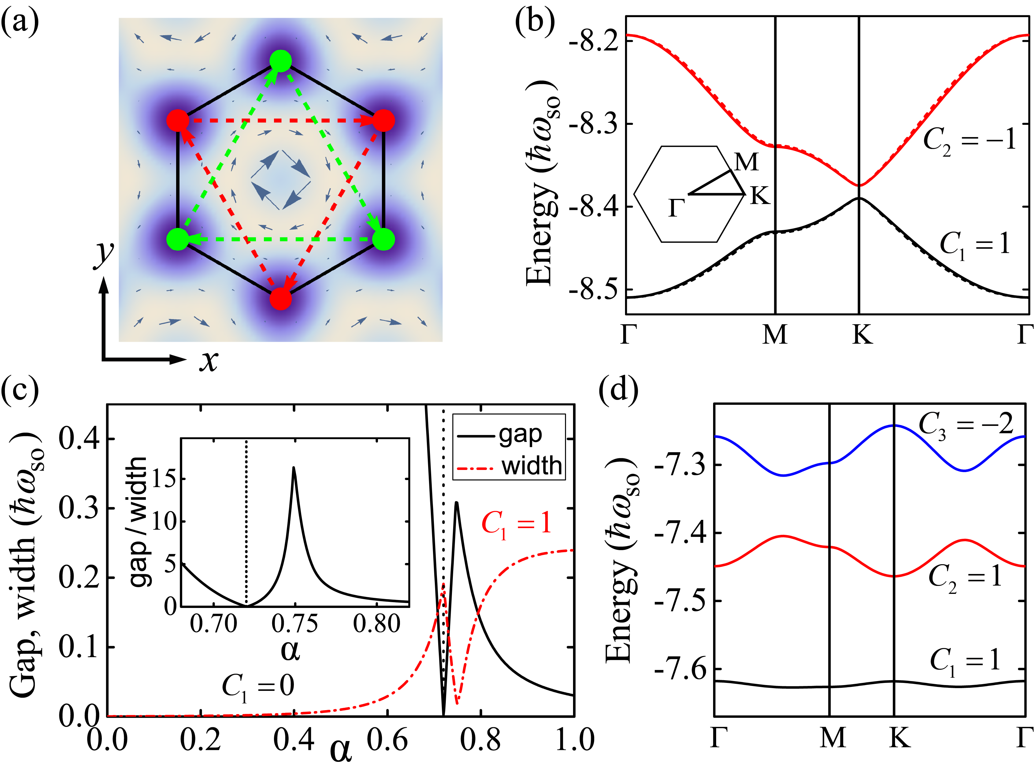 图2. (a)绝热极限下体系的绝热势以及几何矢势; (b)系统的能谱; (c) 拓扑相变; (d)拓扑平带.