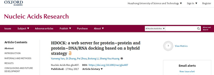5月17日,核酸领域国际权威期刊《核酸研究》(Nucleic Acids Research)在线刊发了学院生物物理研究所黄胜友教授团队题为《HDOCK:一个基于复合策略的蛋白质-蛋白质和蛋白质-核酸分子对接在线平台》(HDOCK: a web server for protein-protein and protein-DNA/RNA docking based on a hybrid strategy)的论文,报道了一种整合自由分子对接和基于模板建模的蛋白质与蛋白质、蛋白质与核酸相互作用结构预测方法,并以在线平台的方式提供给用户。学院2016级博士生严雨蒙为论文第一作者,2015级本科生仉迪为论文第二作者,黄胜友教授为论文通讯作者。