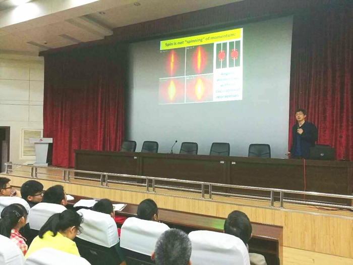陈院长从比萨斜塔实验中的两个铁球同时落地谈起,介绍了物质波的概念,以及广义相对论、规范场论、量子力学、波粒二象性、自旋、时空的弯曲和扭曲等物理学前沿知识,阐述了物理和物理思维的特点。陈教授同时还介绍了我院在物质波方面的研究及最新进展,以及我校在我国科技、军事、航天等领域所做的贡献。报告后陈院长与在场同学进行了热烈的互动。