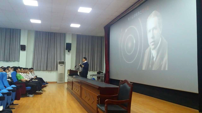 蔡老师首先简单介绍了学校和学院的基本情况。结合个人研究方向,他从物体的运动规律—牛顿定律入手,从电子运动的量子化讲到激光的发明,从电子运动的分身术讲到到量子计算,从电子运动规律讲到量子精密测量,深入浅出的介绍奇妙的物理。报告后蔡老师还与在场同学进行了热烈的互动。