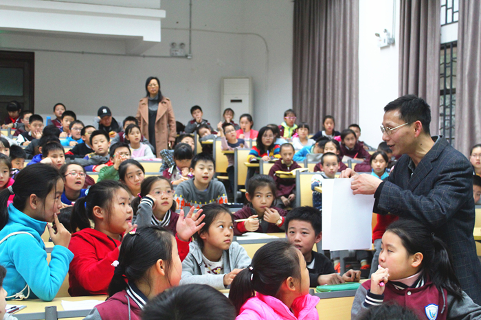 2017年11月16日,华中科技大学附属小学五年级共330多名学生及老师来到物理学院大学物理教学中心参加课外科学实践活动。在西五楼的阶梯教室,朱佑新老师和李彬老师一起准备了精彩的物理科普讲座及多种有趣的物理演示实验。