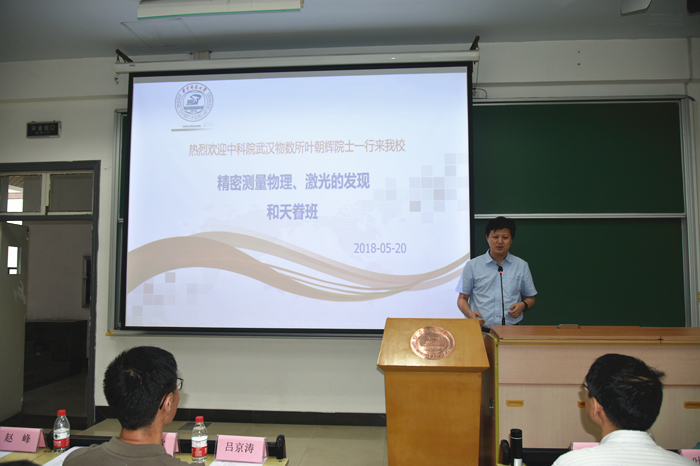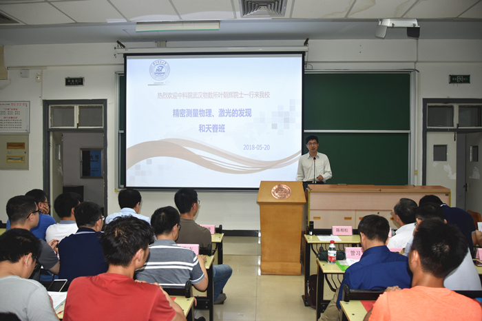 2018年5月20日下午,华中科技大学物理学院与中国科学院武汉物理与数学研究所联合办学的“精密测量物理天眷英才班”开班仪式暨叶朝辉院士专题报告会在西十二教学楼N301举行。中国科学院院士叶朝辉、武汉物理与数学研究所副所长周欣、研究生处处长李涓,物理学院党委书记张凯、院长陈相松、副书记刘会平、副院长吕京涛以及双方部分导师莅临出席。物理学院2017级全体本科生参加了此次开班仪式和报告会,活动由吕京涛副院长主持。