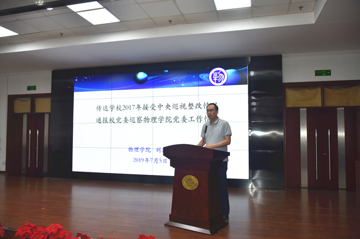 纪委书记刘跃龙首先传达了学校2017年接受中央第十巡视组巡视的整改情况。随后他通报了2019年上半年校党委第三组巡察组巡察物理学院党委的反馈意见,同时将学院的整改思路和整改举措向全院教职工进行了汇报。最后,他还介绍了学院“一张表”工程建设试点工作的情况。