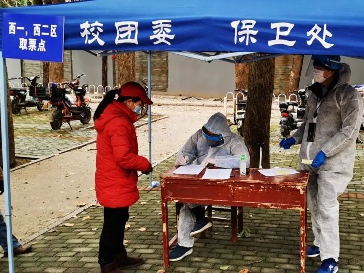 2月13日,学校对校内居住人员限额、限时、凭票出行,设立值班点分发居民出行和购物票证,我院五位教师党员张凯、蔡建明、贾法雷、葛国勤、陈学文分上下午两班,为西一、西二区居住人员发放相应票券并做好登记工作。