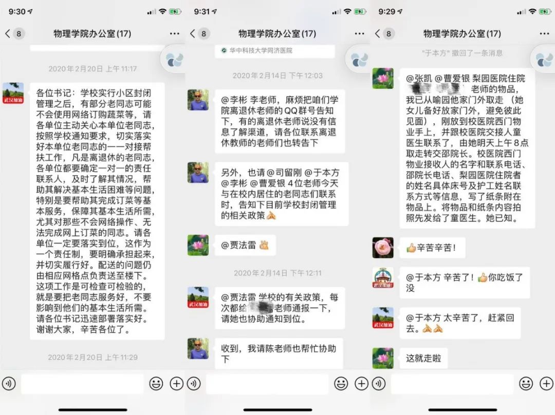 在新冠肺炎疫情的防控工作中,照顾好留校师生、退休教职工的生活也是一大重要任务。为做到联防联控、群防群控,服务好离退休教职工,物理学院党委安排党员与退休教职工一对一帮扶,每日坚持联系,关心询问离退休教师的身体健康,送米送菜送药上门,确保生活无忧。