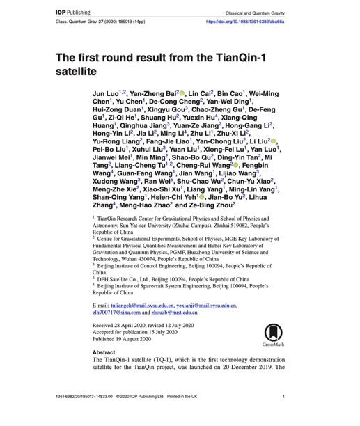 Q:我们都知道“天琴一号”于2019年12月20日在山西太原发射,作为论文的通讯作者,您能为我们解答下,为什么时隔8个月后,才有关于 “天琴一号”试验卫星第一轮实验结果的消息?