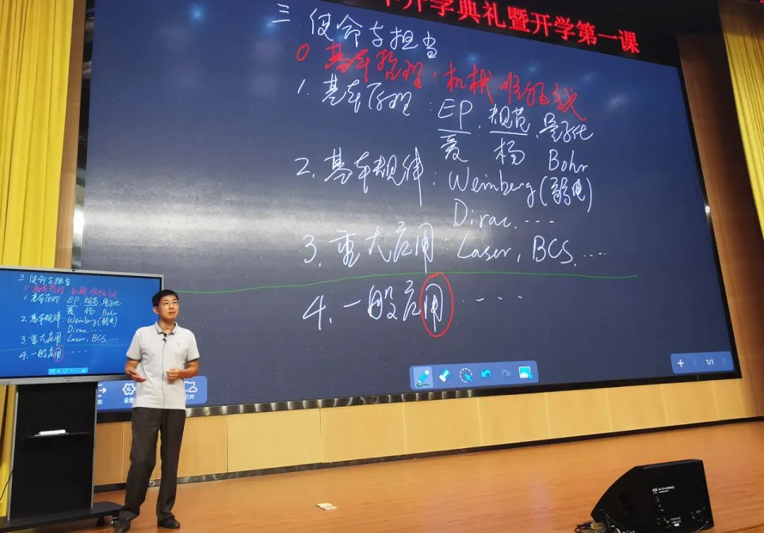 院长陈相松为全体新生讲授了“开学第一课”。开课伊始,陈相松院长在黑板上写下了四个字“强国物理”。他指出,想要实现强国物理,达到高水平自立自强的目标,就需要做到自主操作。