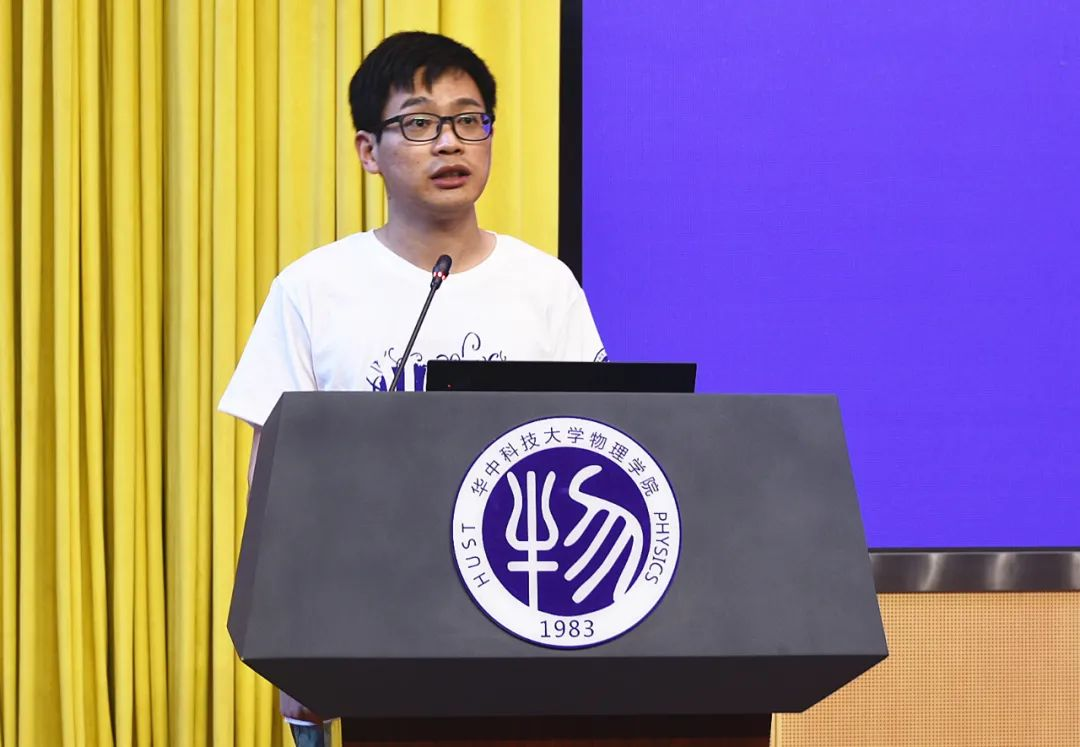 博士在校生代表储耀明发言。他结合自身在华科八年的求学经历,与同学们分享见证学院发展的欣喜,与个人蜕变的宝贵经验。前四年作为本科生是在努力“学”物理,在老师们的带领下循着地图探寻物理学的优美风景;后四年作为博士生的“做”物理,则好比爬一座野山,苦寻相似的风景,却不知道路在何方。然而。尽管前路漫漫,道阻且艰,我们仍要保持对世界的主场感和建设者,直面挑战,躬身入局!