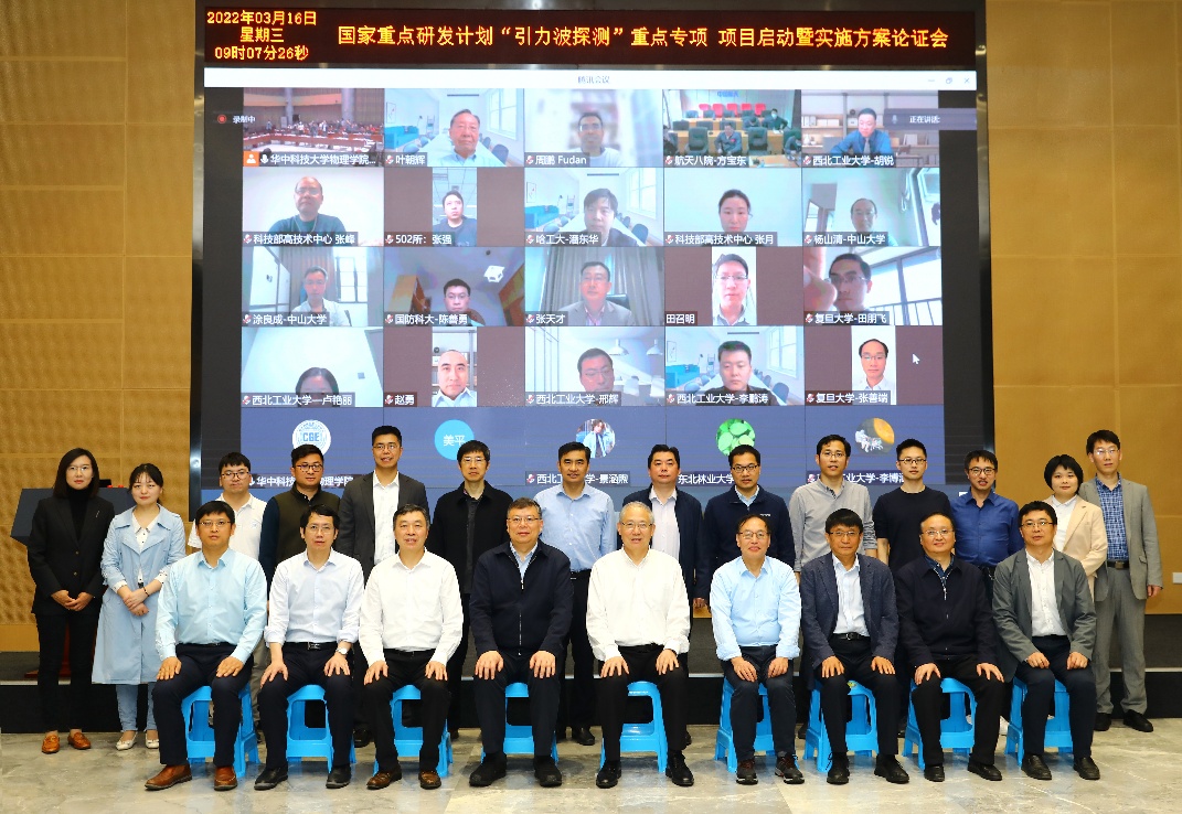 中国科学院院士叶朝辉,“引力波探测”重点专项总体组组长、中国科学院院士罗俊,科技部高技术中心处长张峰,科技部引力波探测专项办公室主管张月,湖北省科技厅基础研究处处长王锦举,以及项目专家组成员,科发院、物理学院主要负责人,项目相关子课题负责人等参加会议。