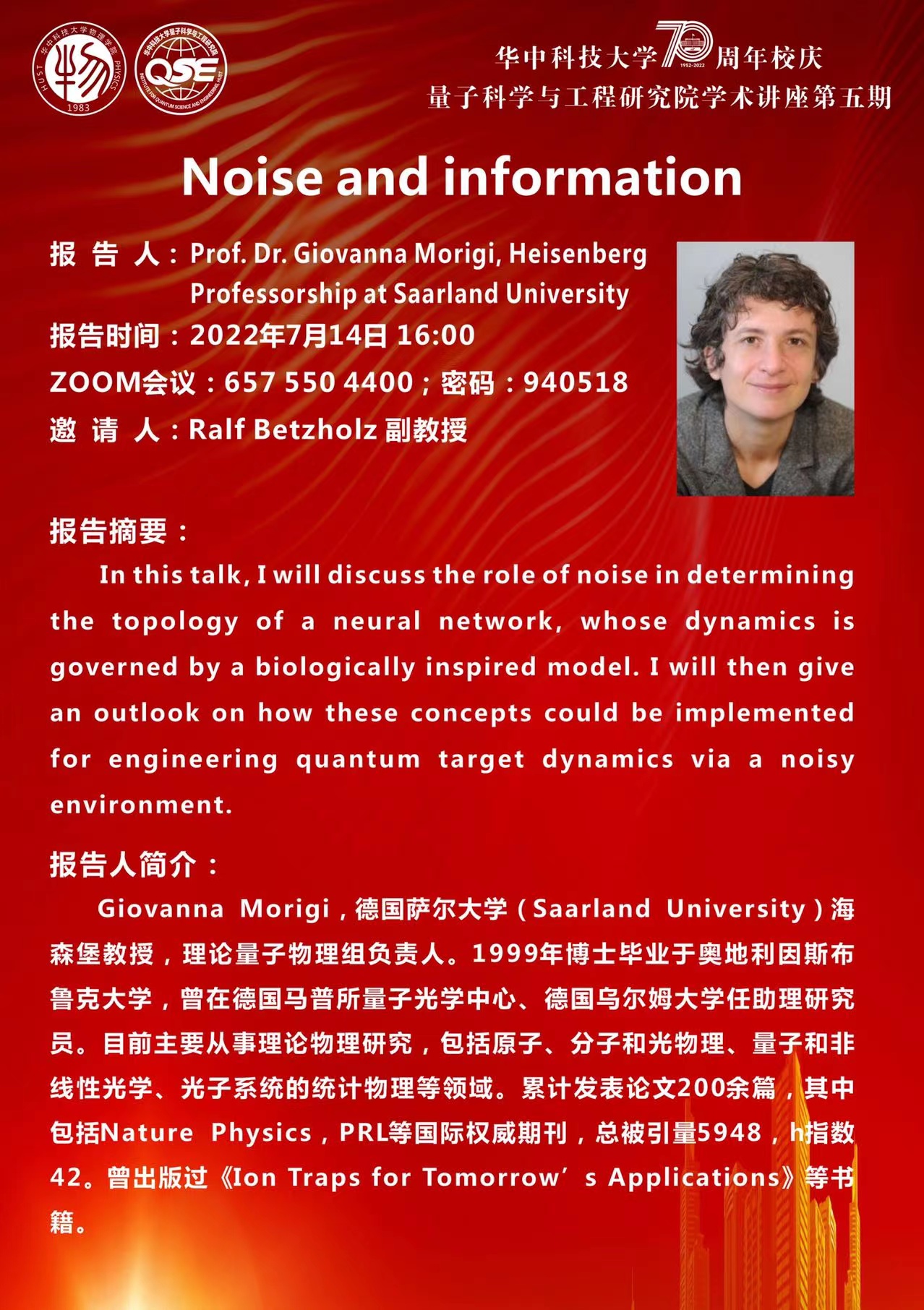 第五期:2022年7月14日,Prof. Dr. Giovanna Morigi,Heisenberg Professorship at Saarland University