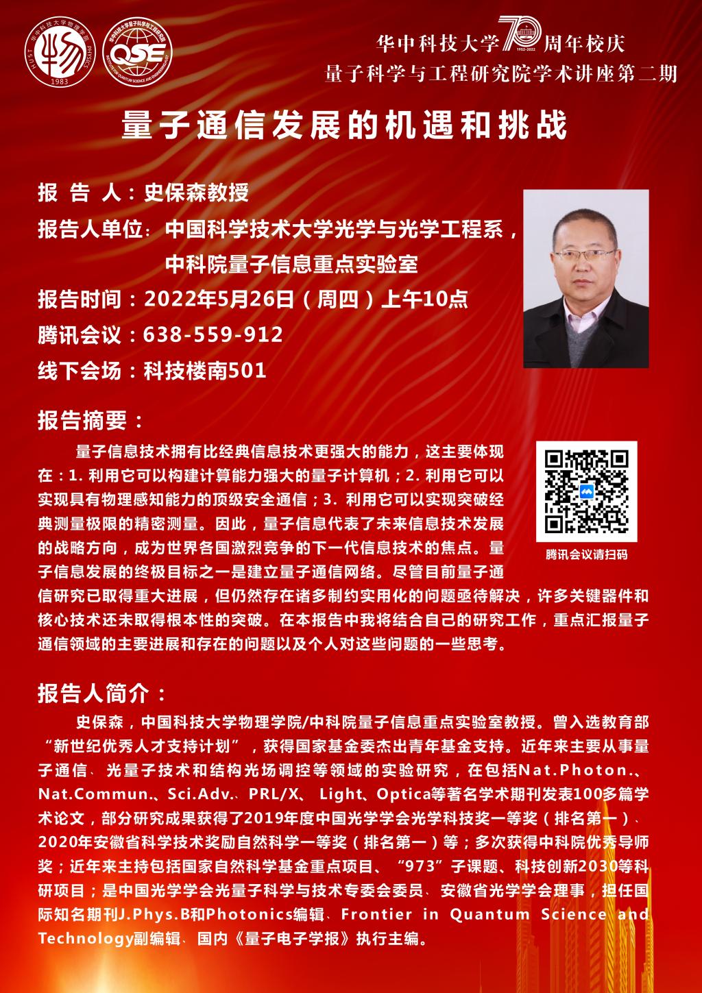第二期:2022年5月26日,史保森教授,中国科学技术大学光学与光学工程系,中科院量子信息重点实验室