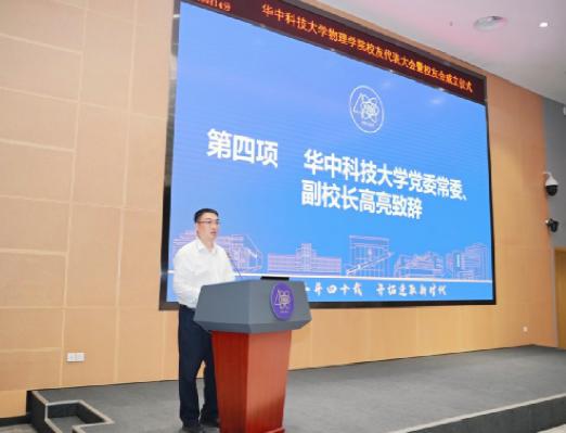 华中科技大学党委常委、副校长高亮代表学校致辞,向出席此次成立大会的各地校友表示欢迎,希望物理学院校友会能够切实打造成为各地校友之间交流合作共赢的平台,打造成为与母校协同创新、协同育人、协同发展的平台,打造成为献计献策、助推母校高质量发展的平台。