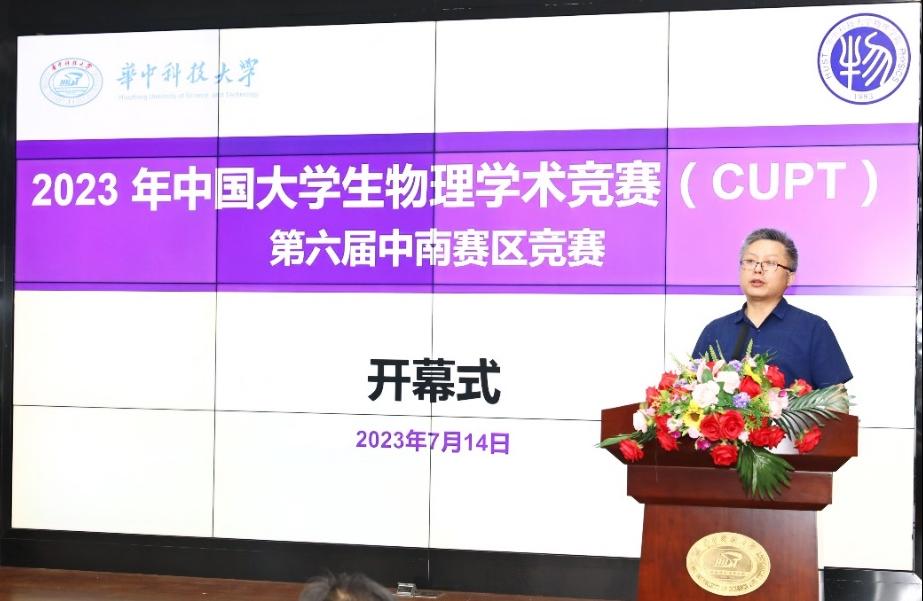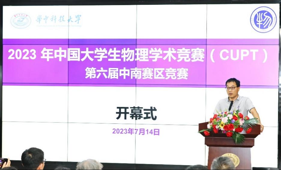 7月14日下午,开幕式在科技楼南104会议室隆重举行。中国大学生物理学术竞赛中南赛区竞委员主任、武汉大学何春清教授,华中科技大学物理学院院长蔡建明教授等中南地区兄弟院校师生共200余人出席开幕式,开幕式由物理实验教学中心主任杨光教授主持。