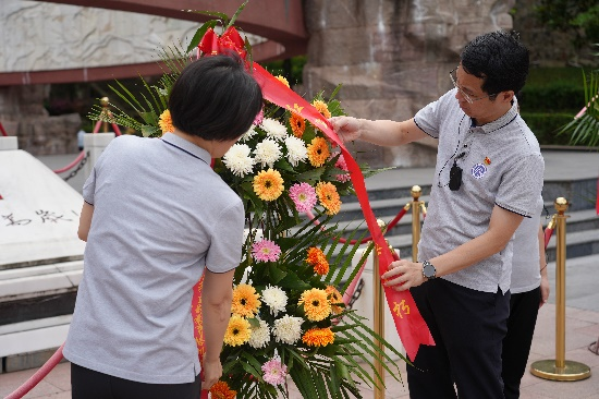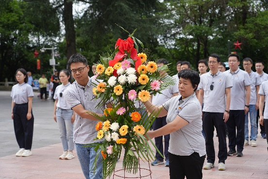 在遵义红军烈士陵园,全体学员面向烈士纪念碑举行了庄严而肃穆的缅怀仪式,向革命烈士敬献花篮,学院党委书记刘会平、引力中心主任周泽兵为花篮整理挽联。在党委副书记姜宗显的带领下,全体党员重温入党誓词。