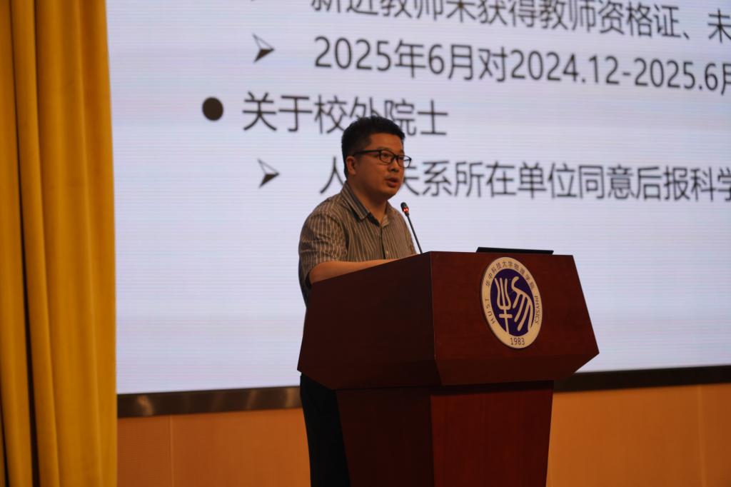 随后,刘书记向全体教职工传达学校2024年暑期工作会议精神。重点围绕张广军书记和尤政校长的报告,传达了学校在人才培养、科学研究、队伍建设等方面的改革思路与举措,重点解读了基础学科人才培养、基础研究等方面做法。她表示学院要在量子科技领域积极推动布局,加快推进精密重力测量研究设施实体化建设,并在科研能力提升项目方面积极做好前期的谋划和凝练。学院将认真落实各项新部署新要求,进一步聚焦拔尖创新型人才自主培养和科技自立自强,提升人才培养和创新能力。最后,刘书记带领大家共同解读职称政策文件,并强调了教育教学工作中的一些注意点。