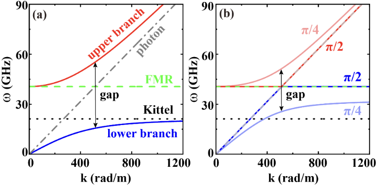 图二:(a)(b)展示了超导|铁磁|超导异质结结构中在不同传播方向下磁子-光子极化激元色散关系。