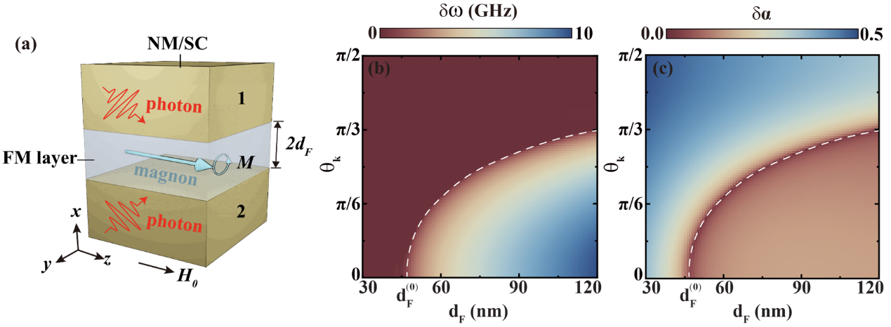 随着自旋电子学和量子技术的迅速发展,磁性异质结在新型量子器件的设计中变得越来越重要。铁磁材料(FM)和正常金属(NM)组成的异质结构,因其独特的磁性和电学特性,成为研究的热点。这些异质结构中的集体激发模式,例如磁子-光子极化激元(magnon-photon polariton),在自旋信息传输和逻辑操作中扮演着重要角色。在这项研究中,课题组深入探讨了金属(超导)|铁磁|金属(超导)异质结结构[图一(a)]中的集体激发模式,重点关注了磁子(magnon)与光子(photon)之间耗散耦合特性。