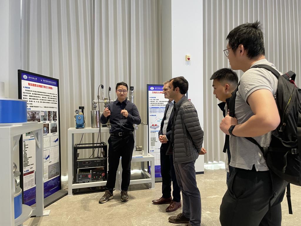 下午两点,众人来到华中科技大学物理学院引力中心,宋培义副教授担任讲解人,详细介绍了精密重力测量国家重大科技基础设施项目发展历程和建筑模型,介绍了万有引力常数G测量仪器、角速度计、超导重力仪等各类设备样本。随后实地参观了山洞实验室和MEMS洁净室。