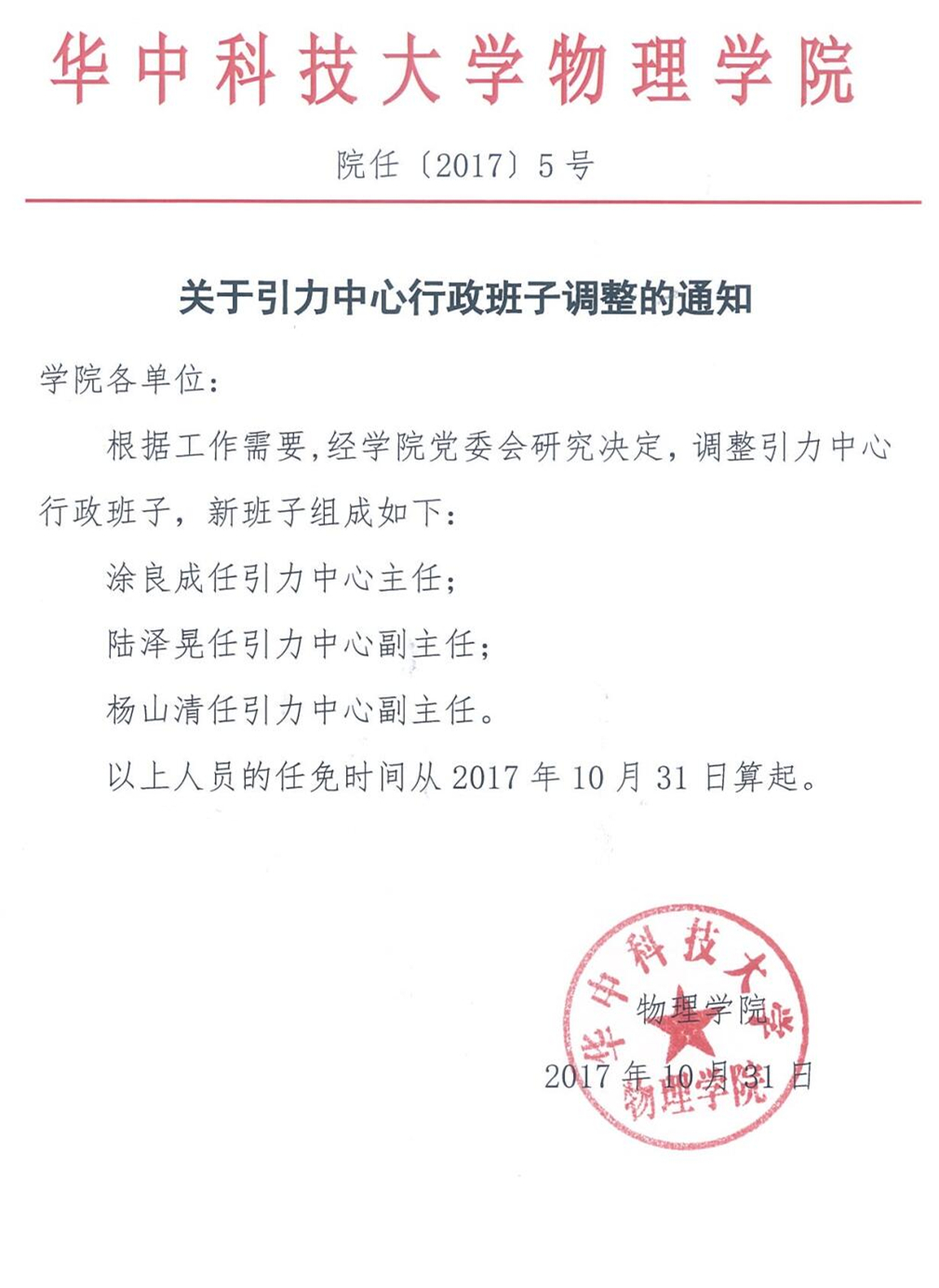 院任(2017)5号关于引力中心行政班子调整的通知