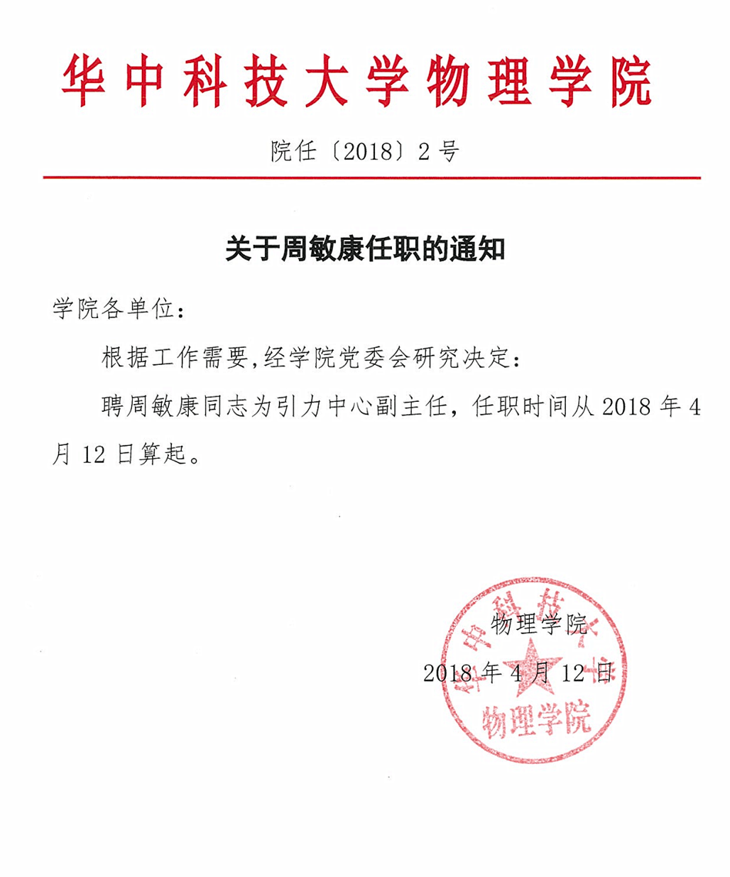 院任【2018】2号关于周敏康任职的通知