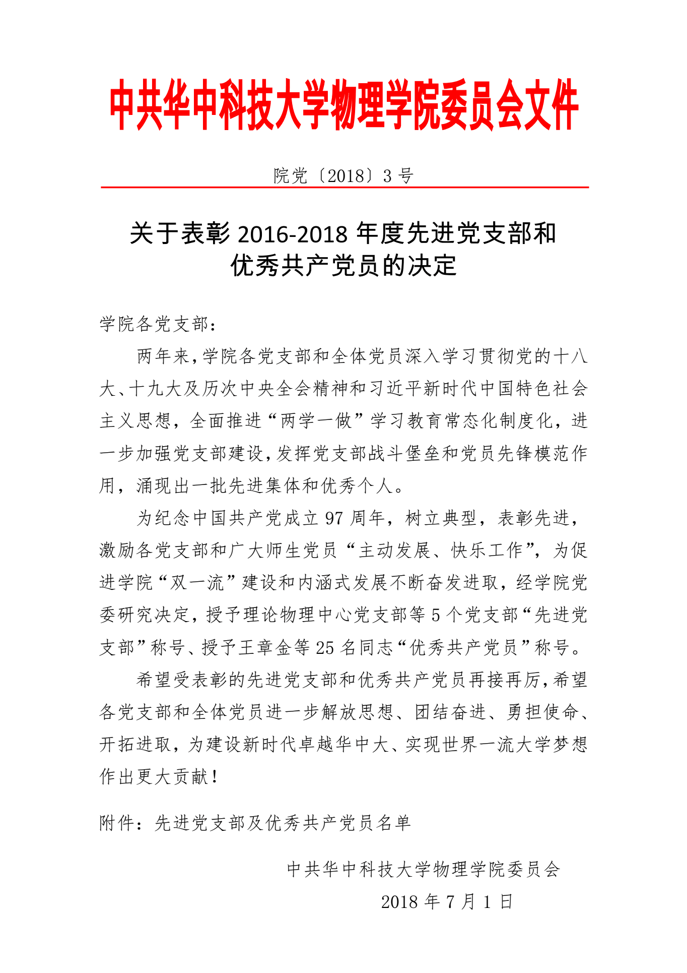 关于表彰2016-2018年度先进党支部和优秀共产党员的决定