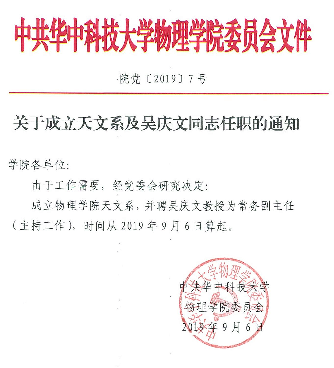 院党〔2019〕7号关于成立天文系及吴庆文同志任职的通知