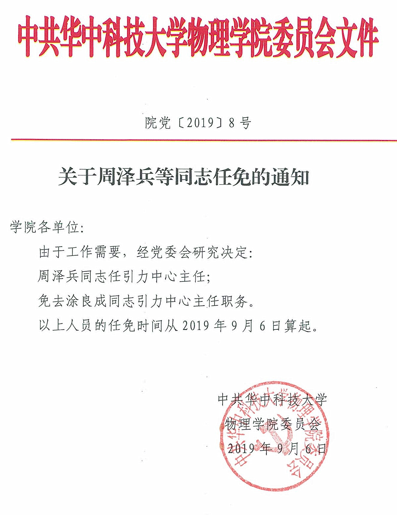 院党〔2019〕8号关于周泽兵等同志任免的通知