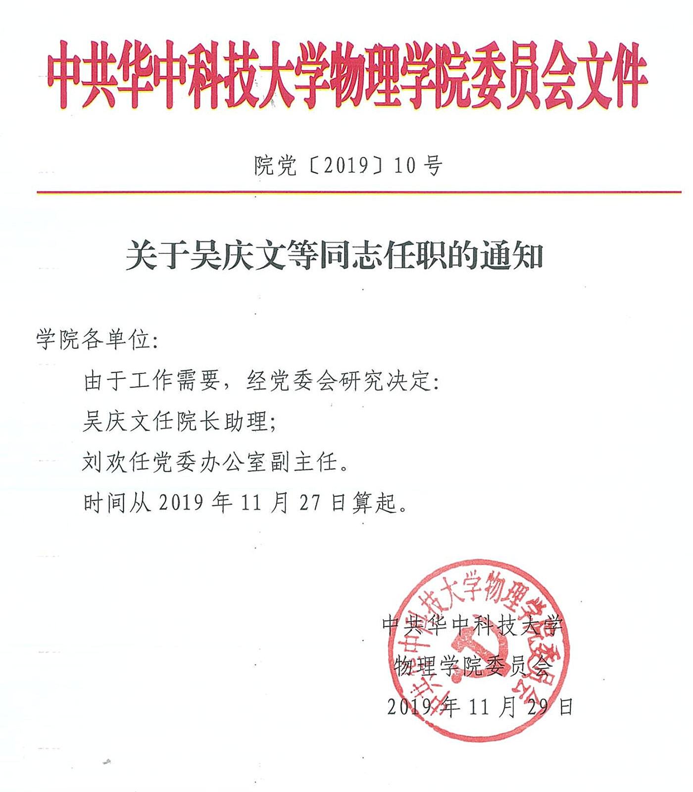 院党〔2019〕10号关于吴庆文等同志任职的通知