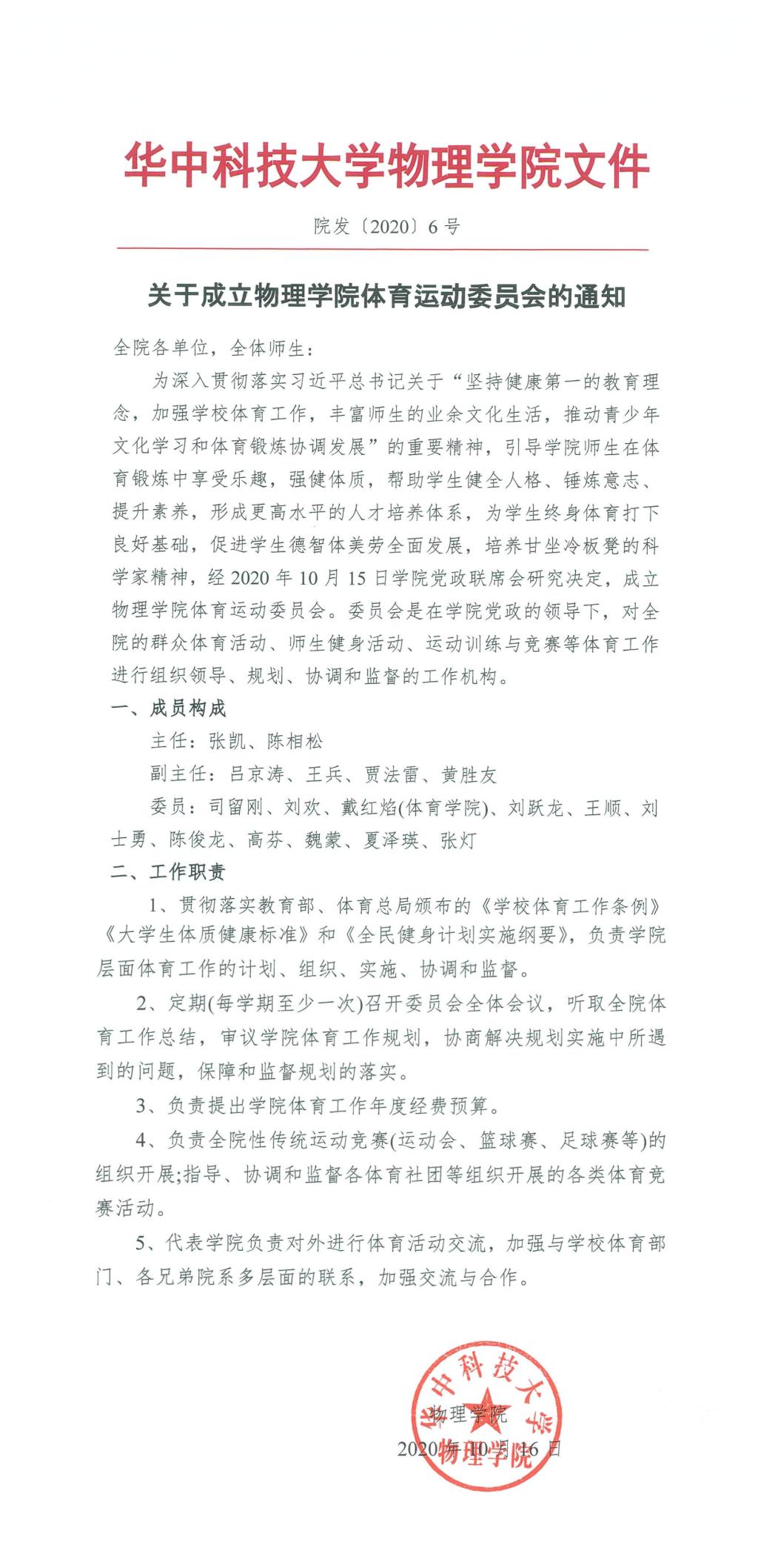 院发〔2020〕6号关于成立物理学院体育运动委员会的通知