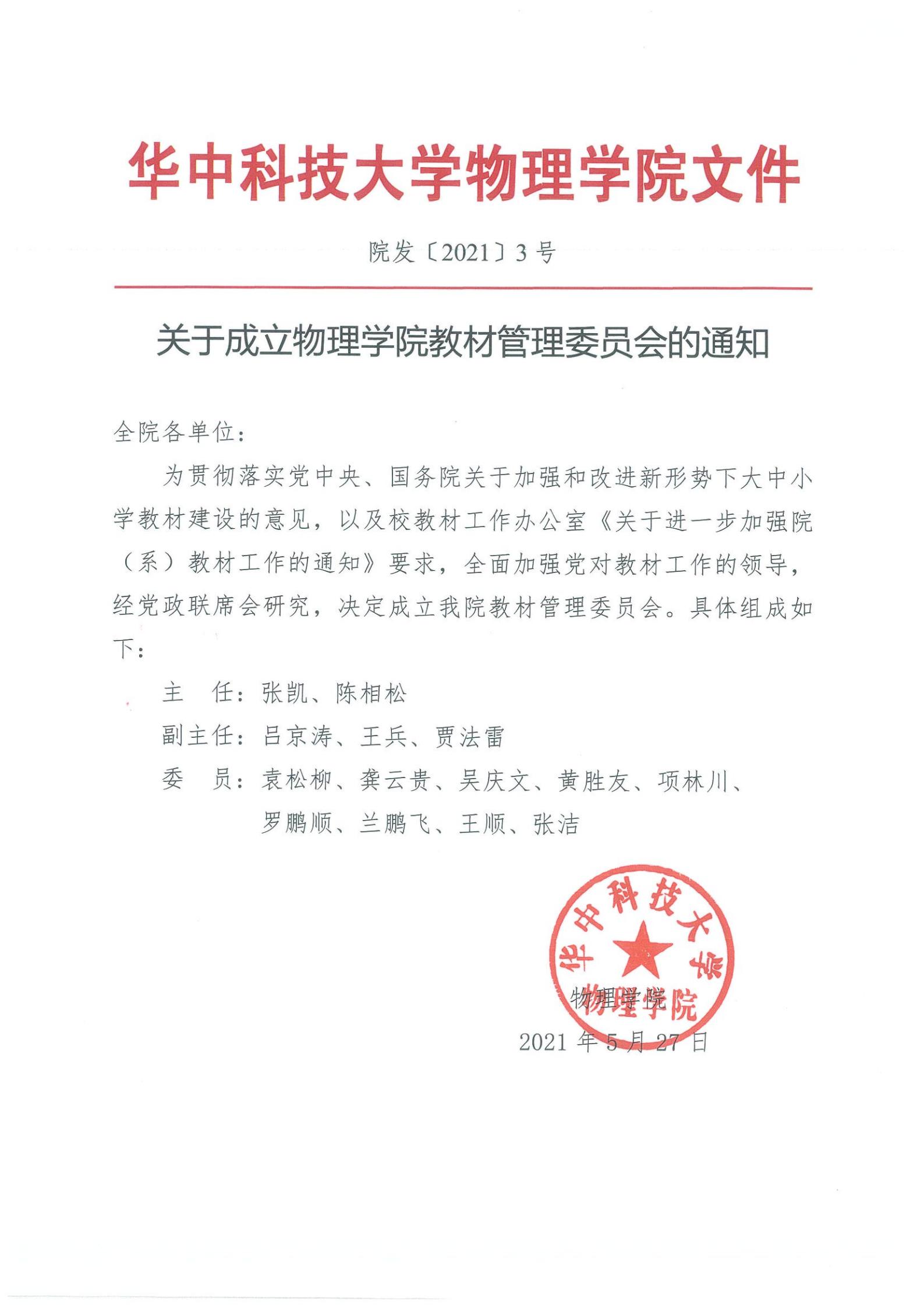 院发〔2021〕3号关于成立物理学院教材管理委员会的通知
