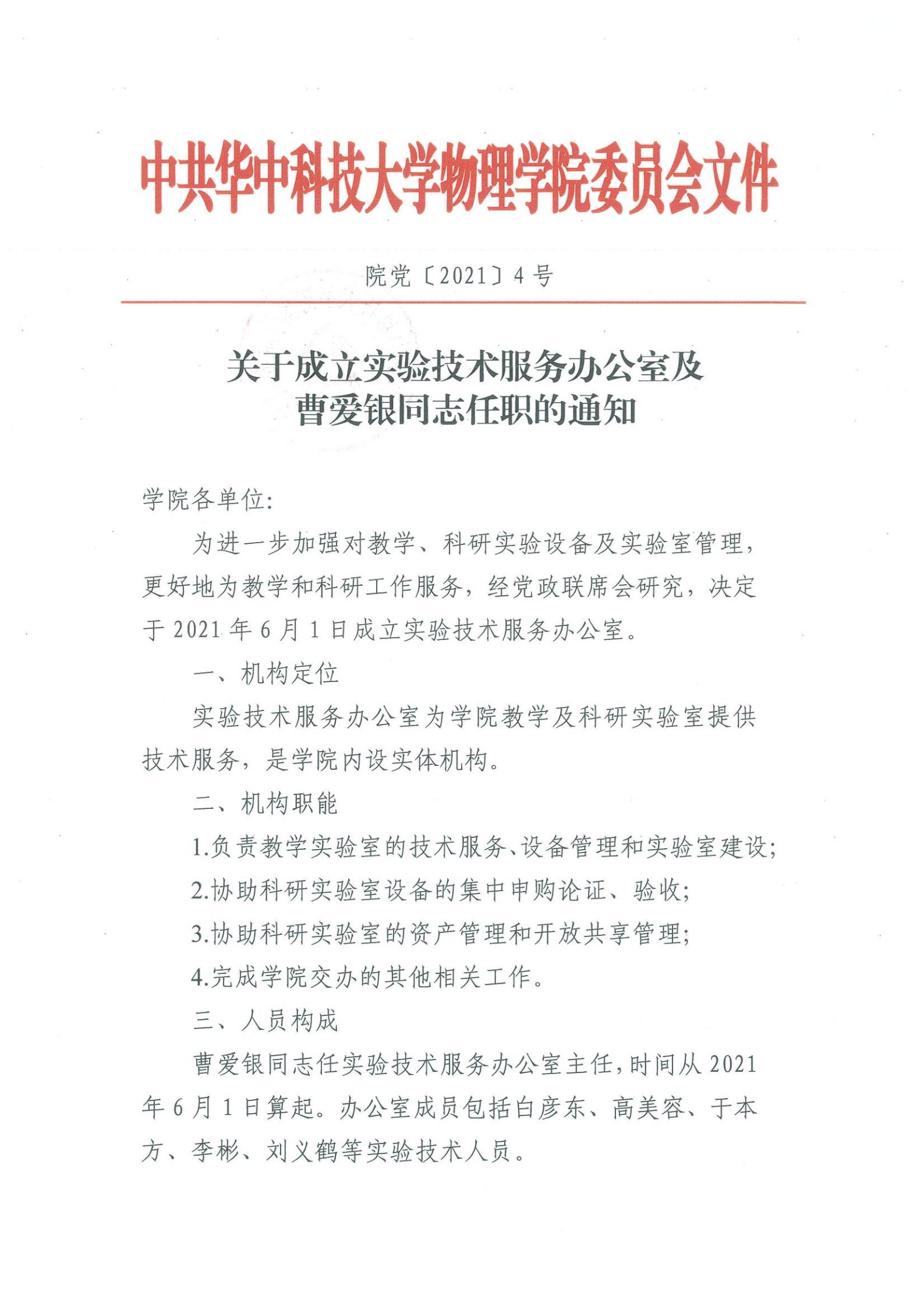 院党〔2021〕4号关于成立实验技术服务办公室及曹爱银同志任职的通知