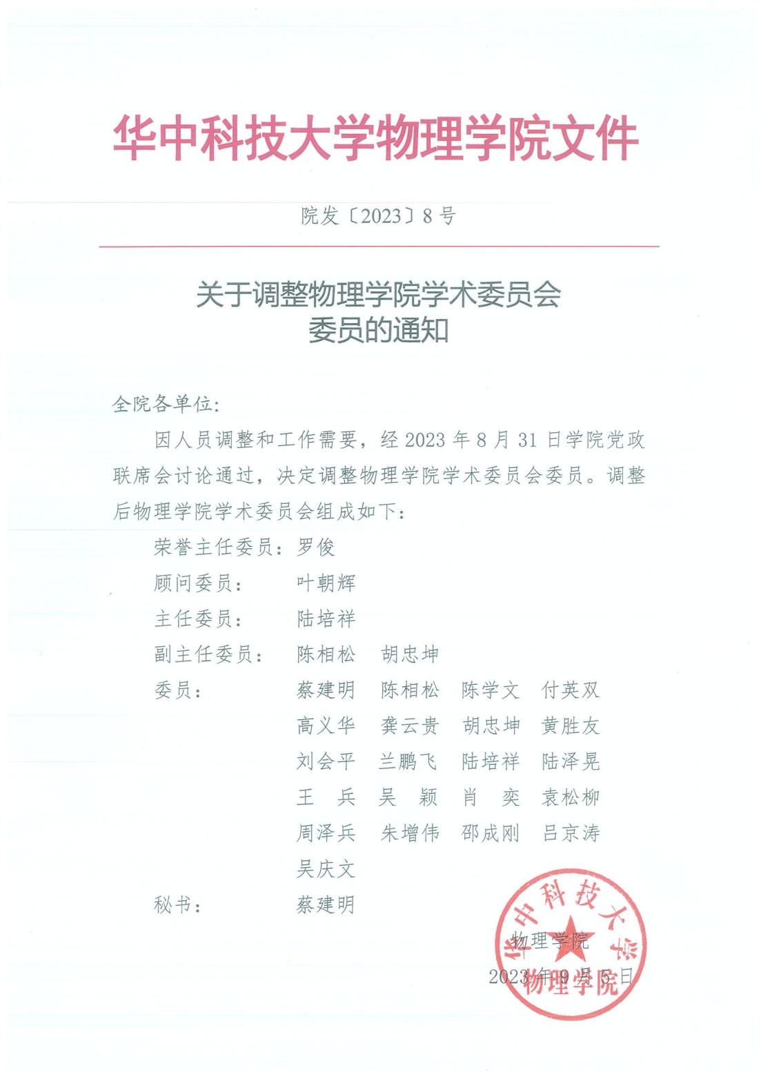 院发〔2023〕8号关于调整物理学院学术委员会委员的通知