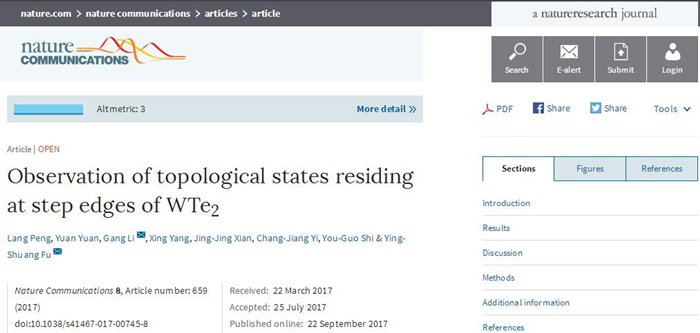 9月22日,《自然·通讯》(Nature Communications)在线刊发了我院凝聚态物理研究所付英双教授团队题为《二碲化钨台阶处拓扑边界态的观测》(Observing topological states residing at step edges of WTe2)的论文。我校为论文第一单位,付英双教授和上海科技大学李刚教授为论文共同通讯作者,我院2014级博士生彭浪和2015级博士生袁渊为共同第一作者。