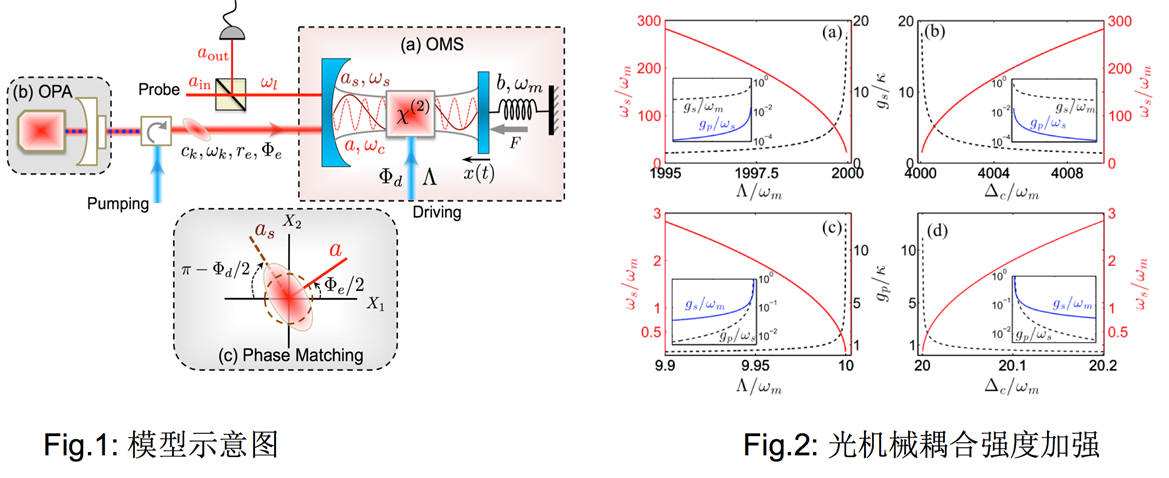近年来,随着机械振子基态冷却的实验实现,腔光机械系统在量子光学以及非线性光学领域引起广泛关注。相关理论研究指出单光子强耦合机制(即:单光子诱导的光机械耦合强度大于光场的衰减率)是在腔光机械系统中实现各种少光子甚至单光子量子操控的必要条件。然而现有的实验条件很难实现此强耦合机制(相差3个数量级之多)。我院量子光学研究团队在系统研究相关问题的基础上,提出了如何在现有的实验条件下(弱耦合机制)实现相应的单光子量子操控的理论方案(如图1所示),例如光子阻塞,声子边带调控等等。他们指出通过有效利用光学参数放大产生的腔内压缩,可以极大地提高非线性的光机械耦合强度(从弱耦合机制提高到单光子强耦合机制,如图2所示)。同时,参数放大引起的环境有效加热效应,可以通过向腔内注入宽频压缩真空场来有效抑制。此研究工作已发表在 Phys. Rev. Lett. 114, 093602 (2015), 为实验实现基于弱耦合腔光机械系统的单光子量子调控提供理论指导。