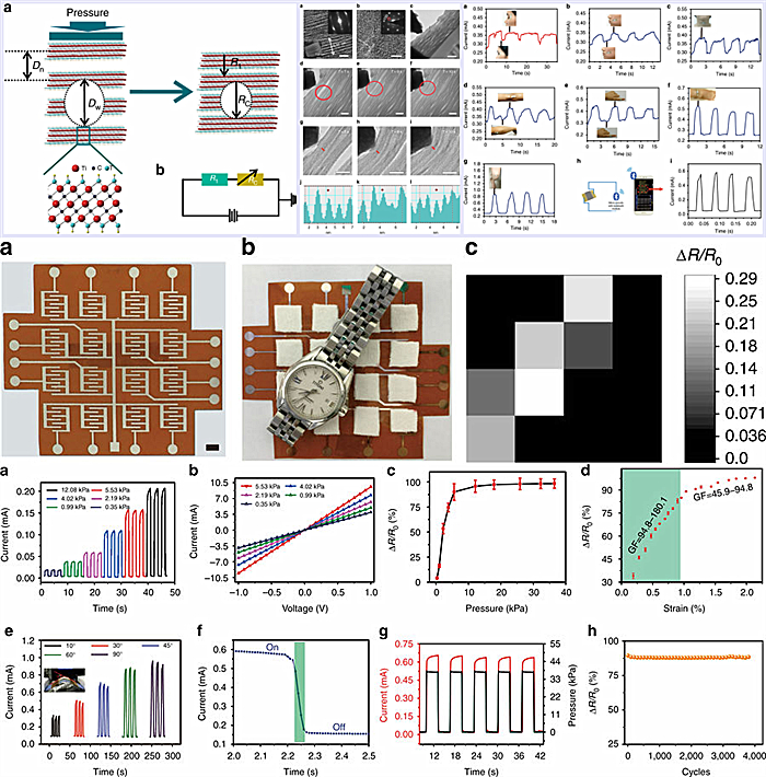 高义华教授研究团队多年来一直致力于用透射电子显微镜(TEM)原位研究微纳材料在外界作用下(力、热和光)的变化,从而研制出性能优异的相关新型器件。该团队选择性刻蚀制备出了一类MXene材料(Ti3C2),用聚焦离子束(FIB)电镜进一步加工制备出测试样品。同时,与武汉大学王建波教授等人合作,进行力作用下的原位透射电子显微镜观察从而证实了大的层间距变化。这种压力作用下MXene的层间距离减小,促使相应导电通路的产生和电流的增加,电阻减小;当撤去外力后,层间距恢复,导电能力恢复至原始状态。经过数百次的来回压缩,原位扫描电镜研究显示MXene仍然可以恢复至最初的结构状态,表明其具有优良的可重复性。该团队借助于柔性聚酰亚胺叉指电极,制备了一种基于层间距离极大可调的MXene高灵敏柔性压阻传感器。该器件显示了极高的灵敏度(GF:180.1),极快的响应时间(<30ms),极好的循环稳定性(>4000次),为拓宽MXene的其它应用提供了新的途径。