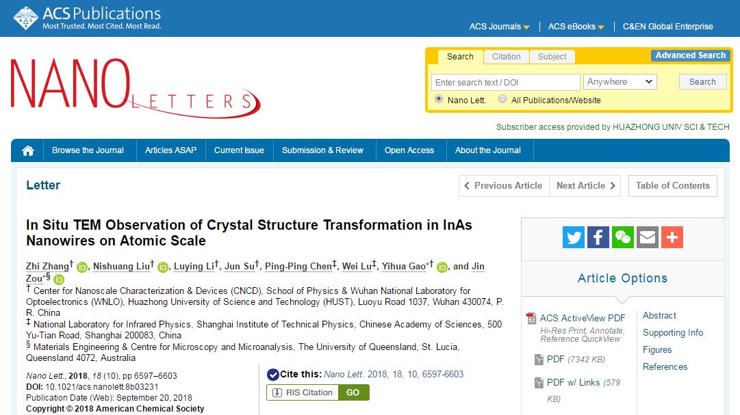 9月20日,纳米学权威期刊《纳米快报》(Nano Letters)在线发表了我院高义华教授团队题为《原子尺度、原位TEM研究InAs纳米线晶体结构的转变》(In Situ TEM Observation of Crystal Structure Transformation in InAs Nanowires on Atomic Scale)的研究论文,报道了在透射电子显微镜中原位加热纳米线,实时观察纳米线晶体结构的转变过程,并直观解释纳米线晶体结构转变的微观机制。我院张智副教授为论文第一作者,高义华教授和昆士兰大学的邹进教授为论文共同通讯作者。