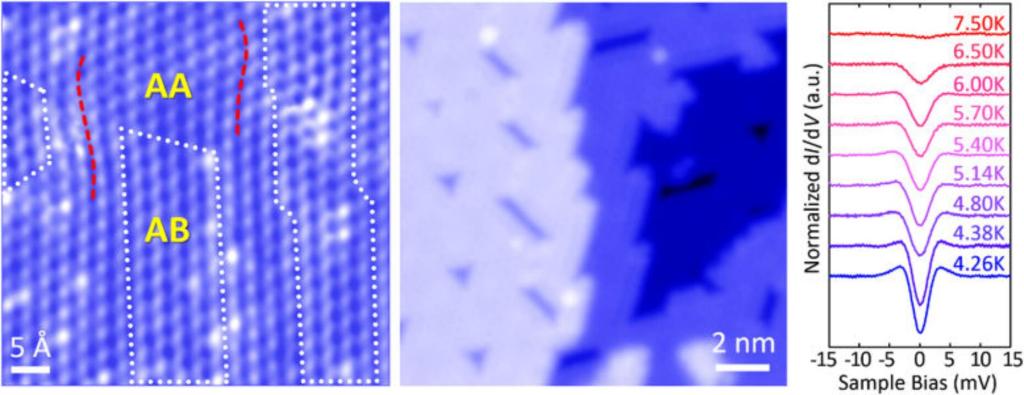 我院潘明虎教授与中科院金属研究所的任文才教授展开合作,首次对直接生长在原生衬底上的2D α-Mo2C开展了STM实验研究。在以Mo原子层为终止面的α-Mo2C上,发现了周期性的晶格调制和不同的原子层堆叠方式的共存,这些结构特征与样品表面出现的应力以及原子层间的相对滑移有关。同时,在2D α-Mo2C的表面上发现了具有特定形状的晶格缺陷,这些缺陷对电子局域态密度的分布以及超导相长度均有一定的影响。通过STS技术,该团队还在2D α-Mo2C的表面上发现了超导电性的增强现象。这种增强效应和表面应力以及结构缺陷均有着紧密的联系。该工作对此类新兴2D材料的制备和研究有着重要的意义。