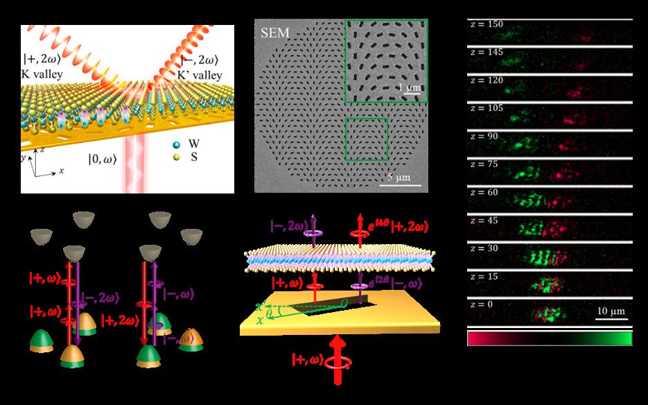 4月1日,《自然·光子学》(Nature Photonics)刊发了超快光学实验室的一项国际合作成果《Coherent steering of nonlinear chiral valley photons with a synthetic Au–WS2 metasurface》。物理学院王凯教授、陆培祥教授和新加坡国立大学仇成伟教授为共同通讯作者,我院16级博士生洪玄淼为共同第一作者。超快光学研究团队和新加坡国立大学仇成伟教授合作,将这种新型非线性光学界面用于单层WS2中非线性能谷-光子的高效激发和操控。通过设计了具有梯度相位信息的金纳米孔阵列,当左(右)旋圆偏基频光通过金纳米孔时,产生带有相位信息的右(左)旋圆偏基频光。根据SHG选择定则,特定能谷K(K')会被激发并产生左(右)旋SHG,实验中测得其自旋度接近100%。由于金纳米孔的局域场增强效应,使光场与能谷相互作用强度增强,测得SHG转换效率提高3个量级。更重要的是,能谷锁定的SHG光子携带了相位信息,可实现控制其出射角度等各种功能。这为二维材料中能谷操控、信息编码与读取提供了非常简洁可靠的途径,可促进室温下非线性、量子和谷电子纳米器件的研究和应用。