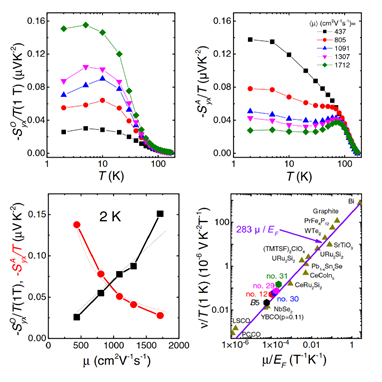 Co3Sn2S2作为一种铁磁半金属材料,存在着巨大的内禀反常霍尔效应,同时也具有非常大的反常能斯特效应。朱增伟教授团队利用化学气相输运的方法生长出了高质量的单晶样品,并通过磁电阻以及霍尔效应的测试定量分析,发现不同质量单晶样品只是样品的迁移率发生了变化。通过对这些样品进行热电输运测量发现,Co3Sn2S2的能斯特信号中的正常能斯特效应与样品的迁移率成正相关,这与之前报道中能斯特效应与迁移率的关系是相符合的。进一步分析发现,Co3Sn2S2样品的反常能斯特效应是由内禀的贝里曲率决定的,并且与样品的电子平均自由程成反相关,这是该团队首次观察到反常能斯特效应与迁移率成反相关,为研究具有非平凡拓扑结构的电子对热梯度的响应提供了新的见解。