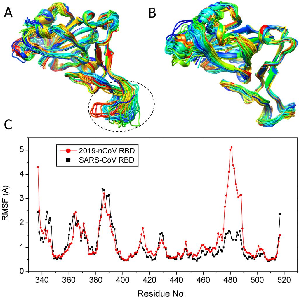 RBD蛋白的柔性分析。(A)10ns MD模拟的50条新冠病毒RBD蛋白代表轨迹,其中椭圆环中部分代表高度柔性区域(残基470-490)。(B)10ns MD模拟的50条SARS病毒RBD蛋白代表轨迹。(C)新冠病毒(2019-nCoV)和SARS病毒(SARS-CoV)RBD的残基RMSFs,其中残基编号来源于新冠病毒RBD,然后SARS病毒RBD的数据根据序列比对来与新冠病毒的数据对齐。