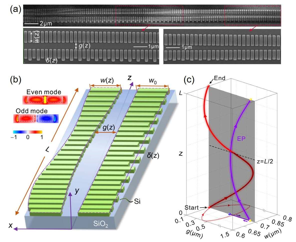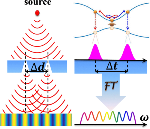 4月16日,《物理评论快报》同一天发表了物理学院陆培祥教授领导的超快光学团队的两项研究成果。其中1篇论文中,超快光学团队将空间域的双缝干涉推广到时间域,发现少周期激光跟固体作用时在时间域会形成阿秒双缝干涉,辐射的固体高次谐波光谱即干涉条纹。利用干涉条纹,他们提出了重构固体能带的方法。相比已有的光电子能谱方法,阿秒时域双缝干涉是一种全光学的方法,在时间分辨能力上具有前所未有的优势,这为研究光诱导的固体超快过程提供了崭新的手段(图6所示)。另1篇论文中,团队成员王兵教授和武汉光电国家研究中心郜定山教授合作,在硅光子芯片上实现了基于非厄米系统动态奇异点绕圈的非对称模式转换。他们利用硅基亚波长光栅波导之间的耦合,引入结构参数和散射损耗的连续变化,提出并实现了动态奇异点的绕圈,在维持高效模式转换的同时,显著减小了器件尺寸,为具有非厄米和拓扑特性等新型功能集成光子器件的设计和研发开辟了新的技术途径(图7所示)。