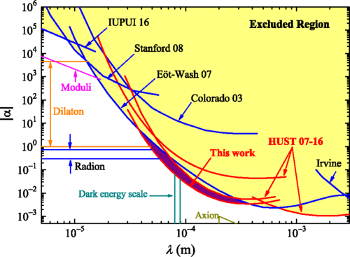 2月5日,《物理评论快报》在线发表物理学院引力中心团队的最新研究成果,在更近距离与更高精度上对引力反平方定律进行实验检验,杨山清教授、罗俊院士为共同通讯作者。研究团队利用我校人防山洞实验室天然恒温、震动小、外部干扰少等优越条件,先后解决了牛顿引力的精确补偿、静电屏蔽系统的残余电势与振动耦合干扰等问题,给出对Yukawa破缺效应在作用程40-350微米区间的最强限制(图5所示)。实验同时给出对幂定律破缺势的最严格限制,为相关的理论研究提供实验参考。
