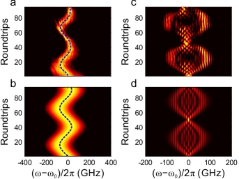 研究人员选取不同谱宽的脉冲作为入射光以记录频率振荡过程。当脉冲频谱较宽时,可认为入射的频率模式具有某一特定的布洛赫波矢,在等效电场力作用下,频谱波包的中心将随着循环圈数沿余弦轨迹进行周期运动。若脉冲频谱包络较窄,可以视为单频入射,频谱则可看作是由许多布洛赫模式叠加而成,等效电场力引起各个模式发生周期相同的布洛赫振荡,导致脉冲频谱演化表现为呼吸状。每经过一个振荡周期,所有频率模式均会回到初始状态,从而实现频率“自成像”。